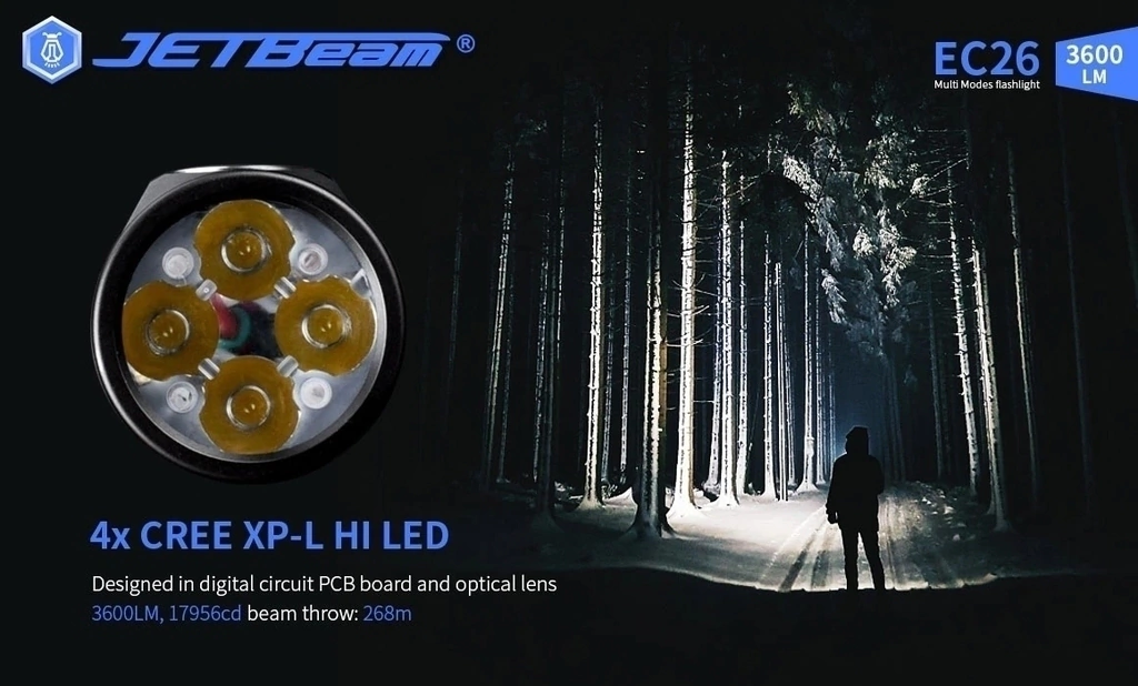 Lanterna Jetbeam, modelo EC26 com altíssimo poder de luminosidade (3600 Lumens reais) e longo alcance de 268 metros. Acompanha bateria 18650 original da Jetbeam de alta capacidade (2600 mah).