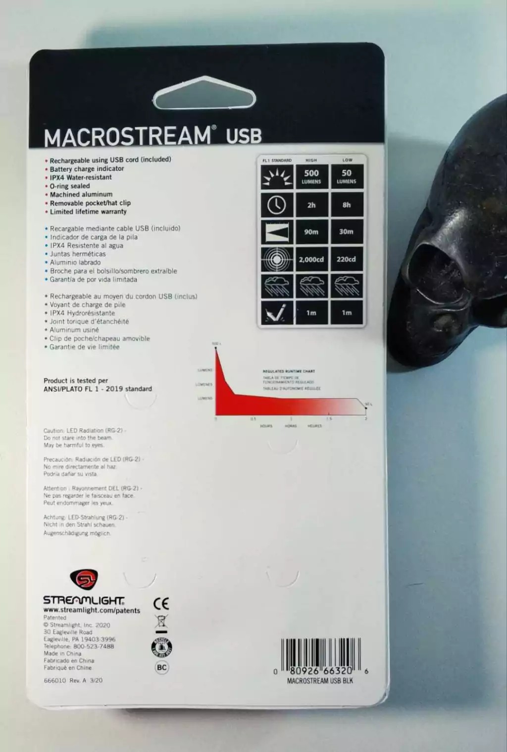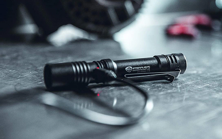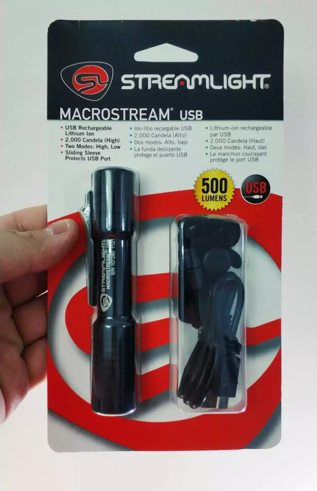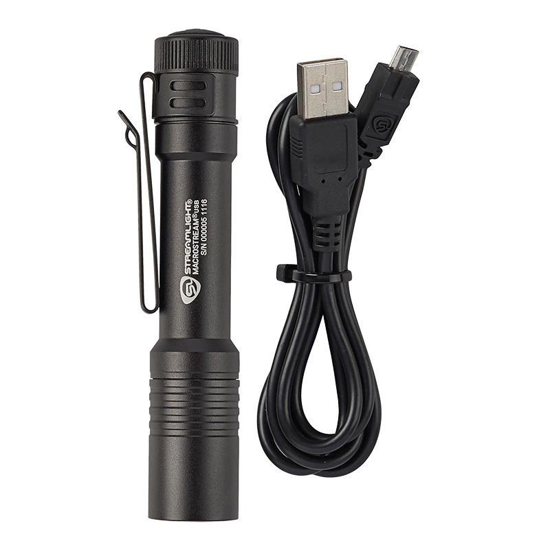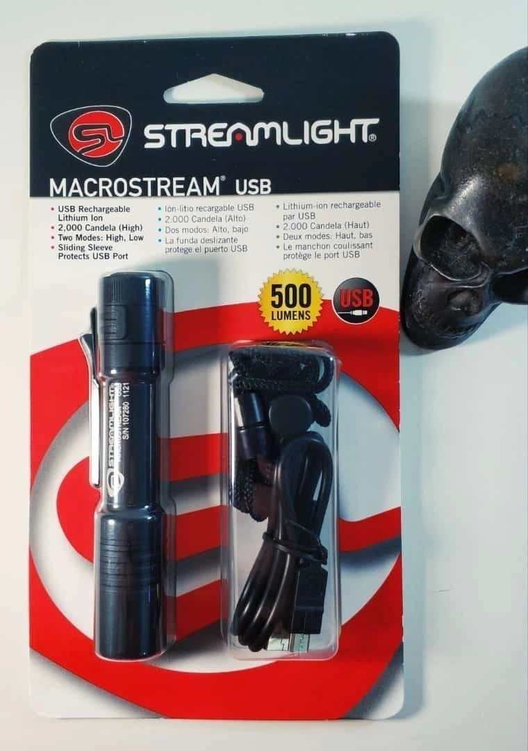 Lanterna da mundialmente famosa Streamlight, versão MACROSTREAM USB, o modelo mais compacto com bateria interna recarregável de lítio, potente (500 lumens) e econômica (até 8h de duração e 2h no modo mais forte) da categoria. Acompanha um pequeno cordão de Nylon para carregar a lanterna e facilitar seu manuseio.